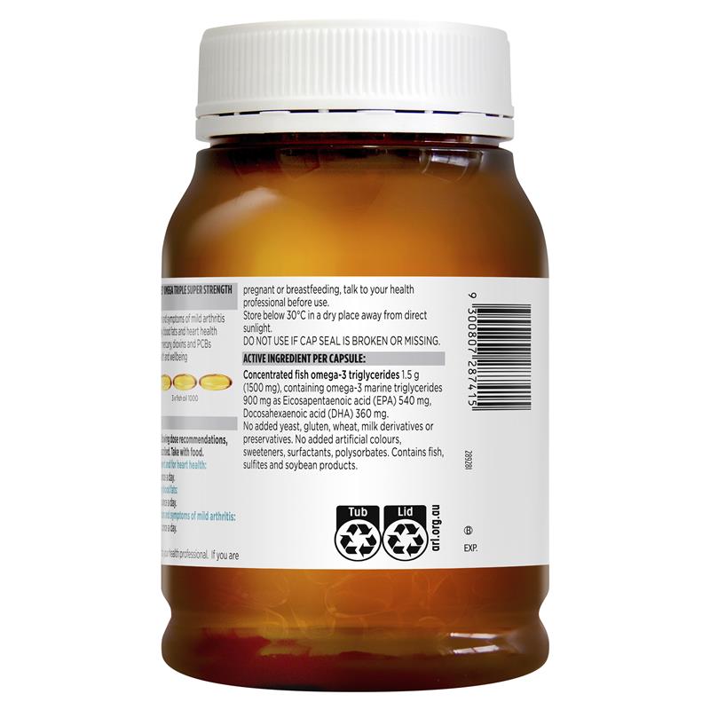 Blackmores 3倍魚油膠囊補充劑 (Omega Triple Super Strength Fish Oil),每粒膠囊的 omega-3 含量是我們標準魚油 1000 粒膠囊的三倍,有助於緩解輕度關節炎的症狀。這種優質濃縮魚油每粒膠囊含有 900 毫克 omega-3,因此成年人每天只需隨餐服用 3 粒膠囊,即可幫助緩解炎症。Blackmores 魚油是從 100% 野生捕撈的魚中提取的。這提取過程確保經過汞、二噁英和多氯聯苯測試的純化、優質油。成人:每天服用 1 粒膠囊,作為 omega-3 補充劑和心臟健康。